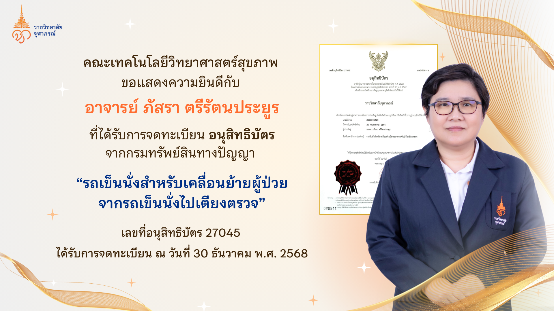 ขอแสดงความยินดี อาจารย์ภัสรา ตรีรัตนประยูร รับอนุสิทธิบัตรนวัตกรรมรถเข็นนั่งผู้ป่วย 27045