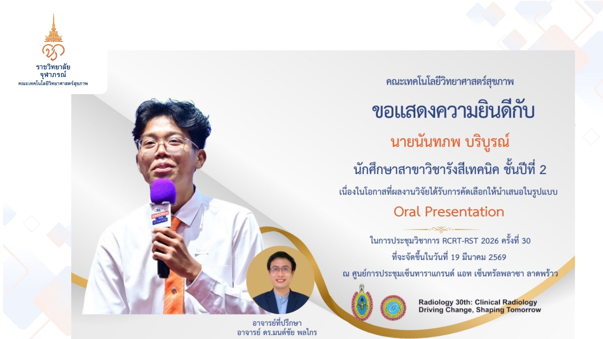 คณะเทคโนโลยีวิทยาศาสตร์สุขภาพ ขอแสดงความยินดีกับ นายนันทภพ บริบูรณ์ นักศึกษาสาขาวิชารังสีเทคนิค ชั้นปีที่ 2 ที่ผลงานวิจัยได้รับการคัดเลือกให้นำเสนอแบบ Oral Presentation ในการประชุมวิชาการ RCRT–RST 2026 ซึ่งถือเป็นความสำเร็จอันทรงเกียรติและสะท้อนถึงศักยภาพของนักศึกษาคณะ คณะฯ ขอชื่นชมความมุ่งมั่นและความสามารถของนักศึกษา รวมถึงขอแสดงความขอบคุณต่อ ดร.มนต์ชัย พลไกร อาจารย์ที่ปรึกษาโครงการวิจัย ที่ให้การสนับสนุนอย่างเต็มที่ ขออวยพรให้นักศึกษาและคณาจารย์ประสบความสำเร็จในการนำเสนอผลงาน และสร้างสรรค์ผลงานวิจัยที่มีคุณค่าต่อวงการรังสีเทคนิคต่อไป