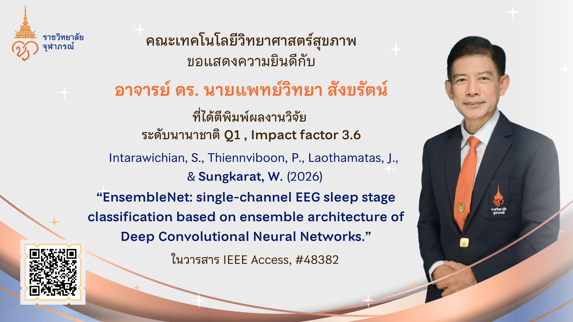 คณะเทคโนโลยีวิทยาศาสตร์สุขภาพ ขอแสดงความยินดีแก่ อาจารย์ ดร.นายแพทย์วิทยา สังขรัตน์ ที่ได้ตีพิมพ์ผลงานวิจัยในวารสารวิชาการระดับนานาชาติ IEEE Access (จัดอยู่ในกลุ่ม Q1) เรื่อง “EnsembleNet: Single-Channel EEG Sleep Stage Classification Based on Ensemble Architecture of Deep Convolutional Neural Networks” ซึ่งนับเป็นผลงานวิจัยชิ้นแรกของปี 2569 ความสำเร็จครั้งนี้เป็นเครื่องสะท้อนถึงความเชี่ยวชาญและความมุ่งมั่นในการสร้างองค์ความรู้ใหม่ เพื่อพัฒนาวงการเทคโนโลยีวิทยาศาสตร์สุขภาพ ทั้งยังเป็นความภาคภูมิใจของคณะอย่างยิ่ง และเป็นแรงบันดาลใจให้อาจารย์ บุคลากร และนิสิตมุ่งมั่นในการสร้างผลงานวิจัยคุณภาพต่อไป